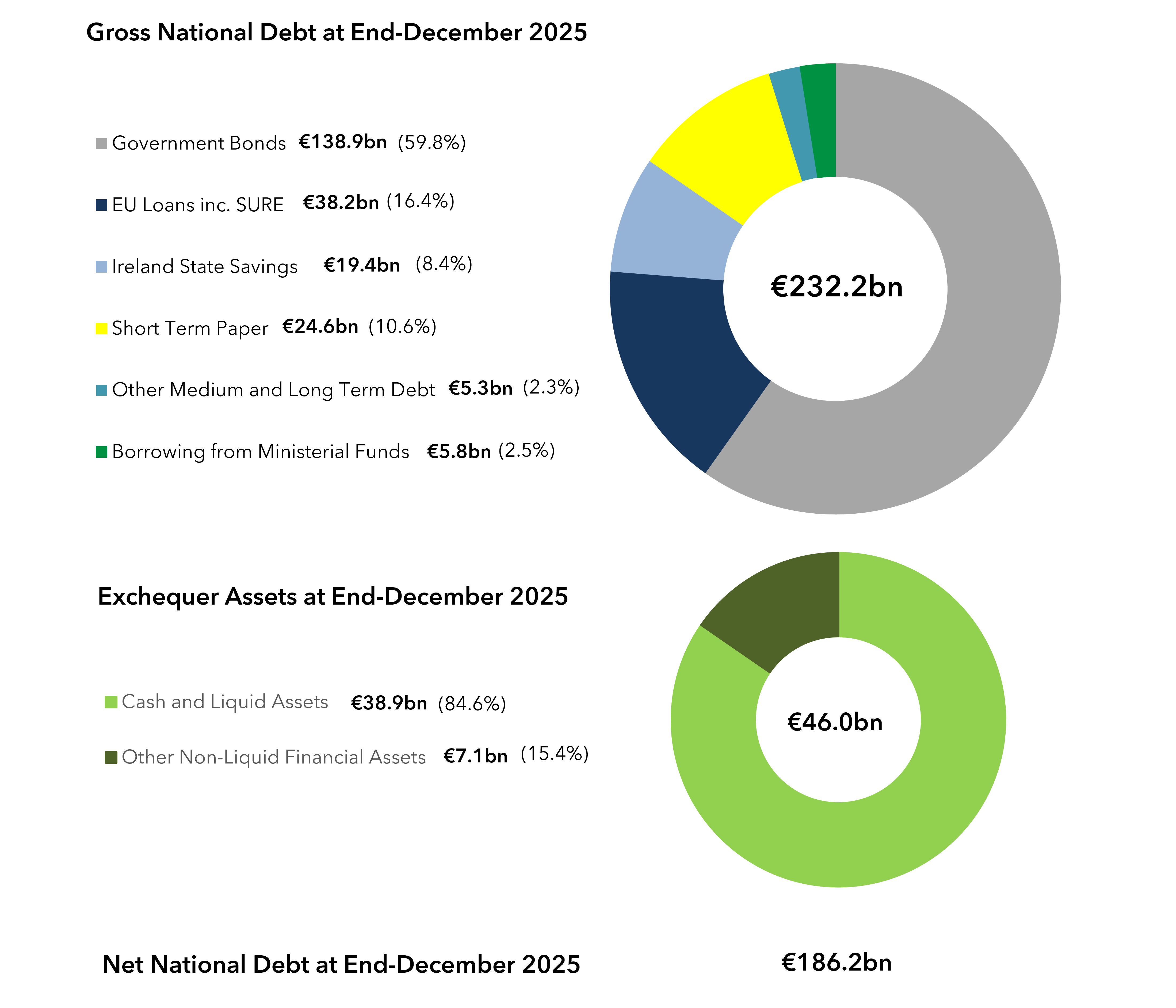 The CSO also produces a measure of General Government Net Debt which it calculates by subtracting from the Gross GGD figure the value of the financial assets corresponding to the categories of financial liabilities which comprise Gross GGD. The CSO reported, in October 2025, that at end-2024 General Government Net Debt stood at €155.0 billion. This is the equivalent of 28% of GDP or 48% of estimated GNI*.