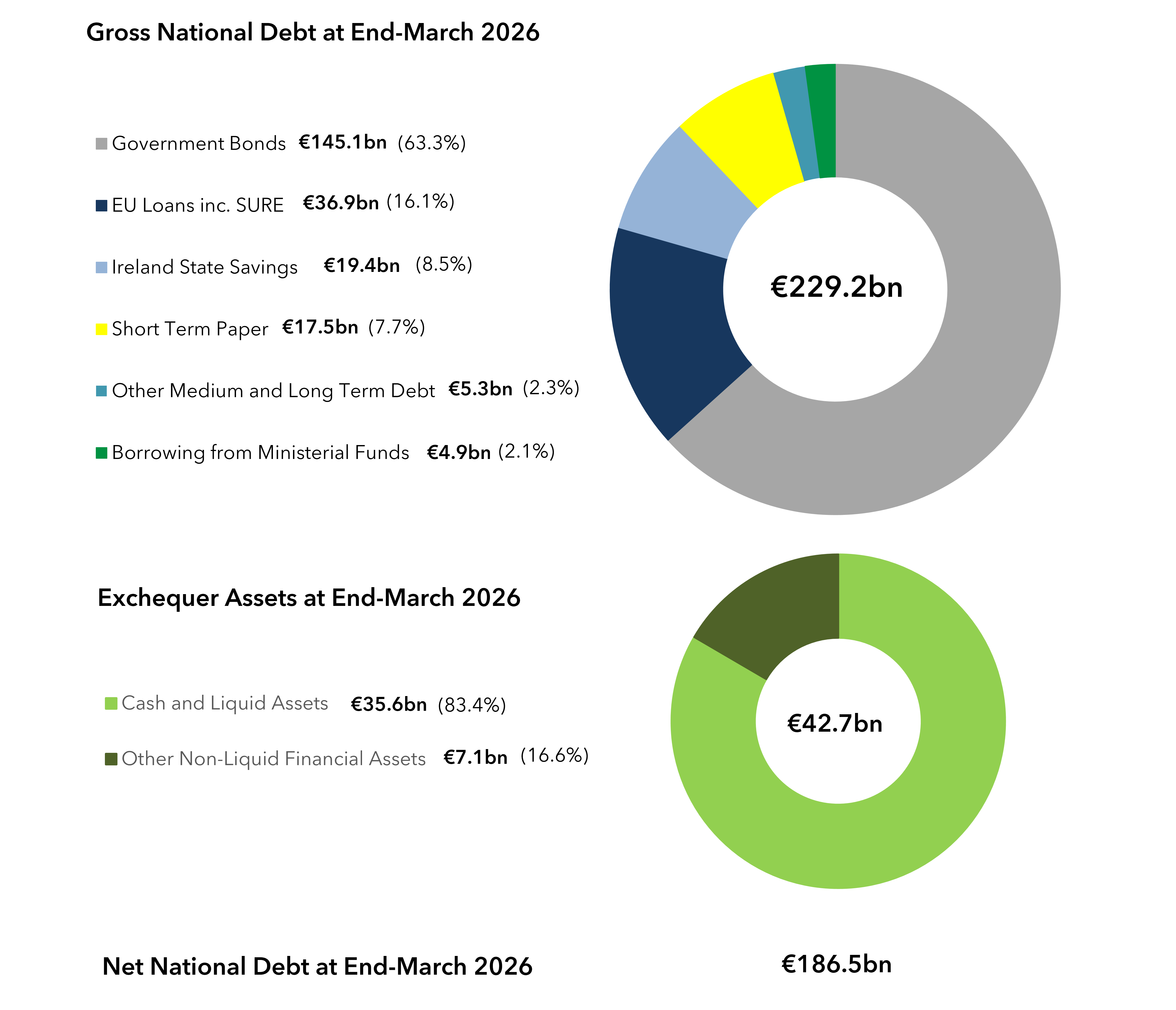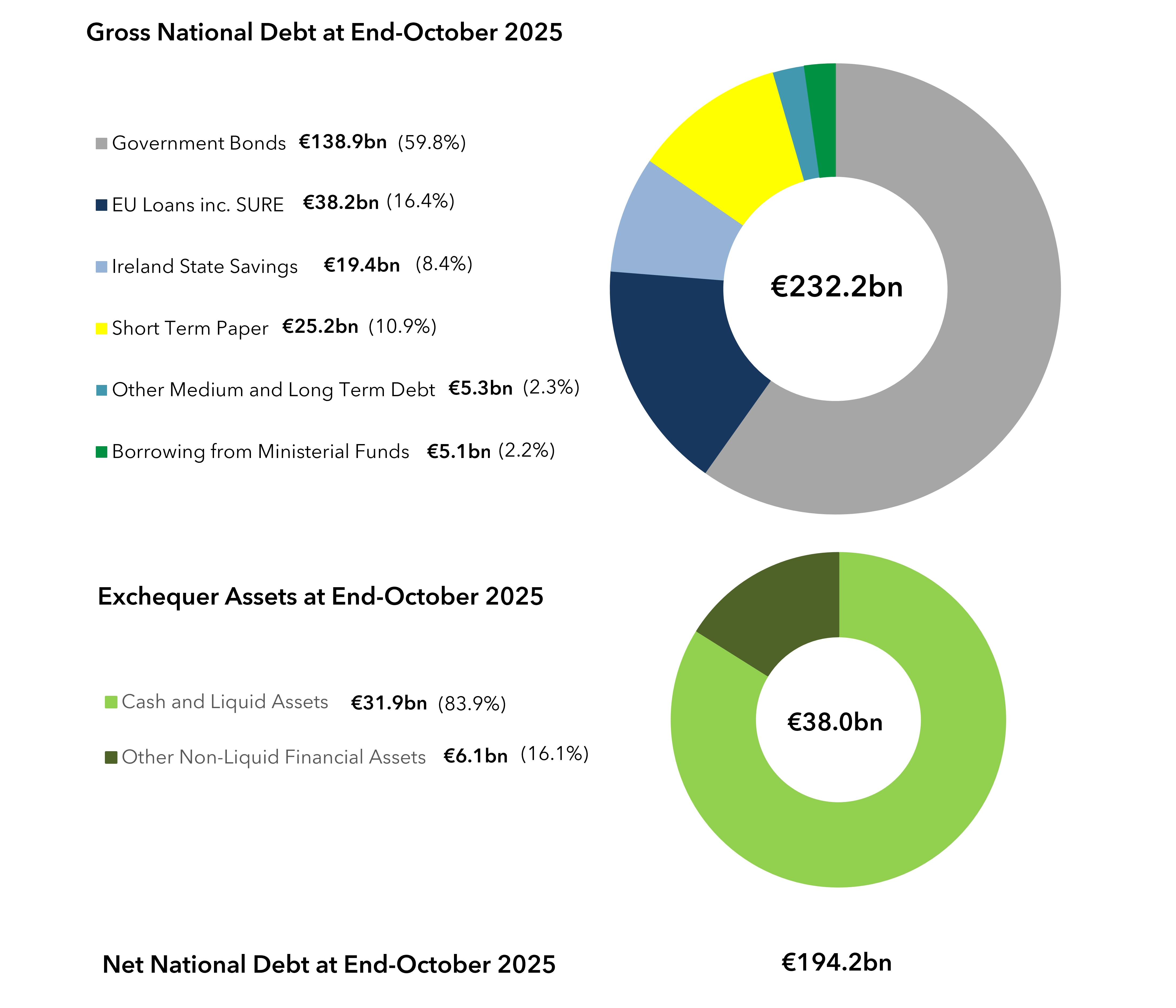 The NTMA's responsibilities relate to National Debt. The NTMA uses two measures of National Debt. The first is Gross National Debt which is the debt incurred by the Exchequer before taking account of cash and other financial assets. The second is Net National Debt which is the net debt incurred by the Exchequer after taking account of cash and other financial assets.