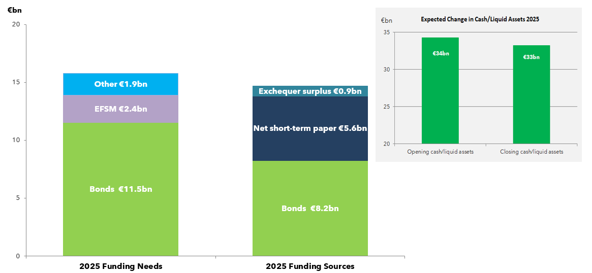 1. In the Funding Sources column, €8.2bn is reflected for bonds as the cash proceeds from €8.5bn of nominal issuance (including from non-competitive bond auctions) in 2025.